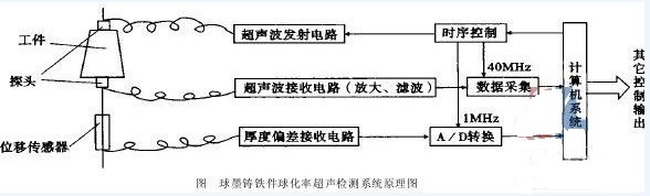 在鑄造行業(yè),球墨鑄鐵件的球化率是產(chǎn)品的一個(gè)重要質(zhì)量指標(biāo),它反映了產(chǎn)品的合格率。球化率的檢測(cè)方法有金相法、超聲波法等。金相法需要人工操作,不適應(yīng)于生產(chǎn)線上的檢測(cè),只能進(jìn)行小批量的樣品檢測(cè)。超聲法則是一種理想的無(wú)損檢測(cè)方法,適于生產(chǎn)線上的快速檢測(cè)和判定。球墨鑄鐵球化率超聲檢測(cè)系統(tǒng)具有操作簡(jiǎn)單、檢測(cè)速度快、結(jié)果準(zhǔn)確、性能穩(wěn)定的特點(diǎn),可實(shí)現(xiàn)自動(dòng)檢測(cè)、自動(dòng)控制,適用于對(duì)一般球鐵鑄件的球化質(zhì)量的在線檢測(cè)。
